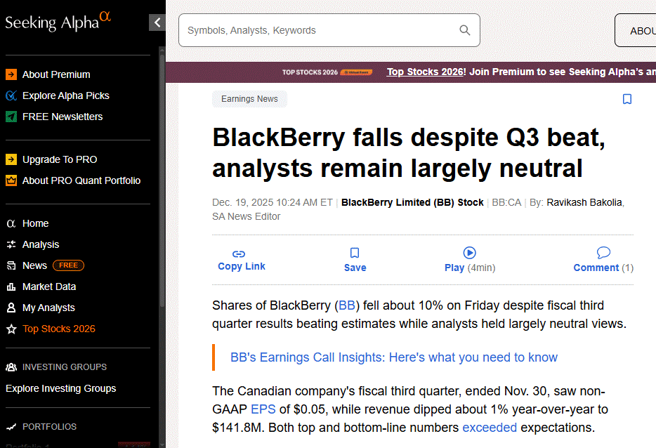 BlackBerry falls despite Q3 beat,