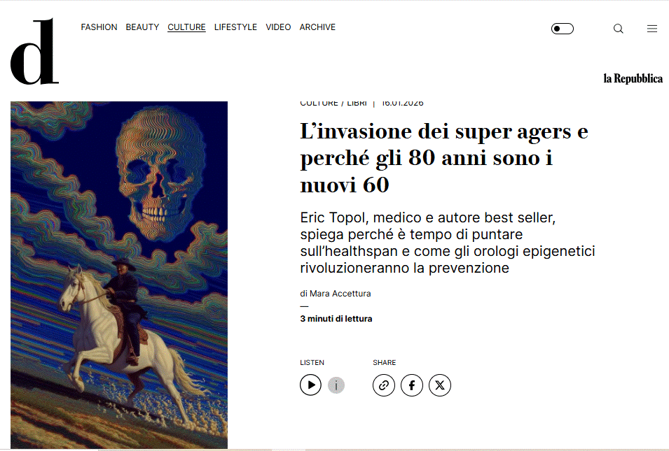 ![]() Descrizione al grafico: “Smettiamola con le sciocchezze. L’immortalità? Non la raggiungeremo mai. E anche gli sforzi diretti alla longevità sono concepiti male. Oggi possiamo tenere in vita artificialmente una persona per molti anni, ma di che vita si tratta? Che senso ha raggiungere i 120 anni con malattie croniche e dipendenti dagli altri? L’invecchiamento non è una malattia da curare, è un processo naturale che possiamo ritardare. Bisogna puntare sull’healthspan, la durata della salute”. Eric Topol è un cardiologo americano, pioniere della medicina personalizzata, e studia persone che invecchiano in modo eccezionalmente sano anche dopo gli 80, mantenendo un’elevata qualità della vita. Su questo ha scritto Il codice della longevità. Super Agers (Newton Compton) dove spiega, separando scienza e leggende, come vivere più a lungo. Già bestseller negli Stati Uniti, arriva in Italia il 13 gennaio.