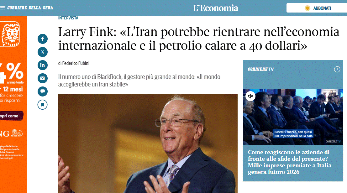 «Il mondo accoglierebbe un Iran stabile, un Iran che non esporta terrorismo. E non è necessario un cambio di regime, ma un Iran che si concentri sui suoi cittadini. Ne parlavo con uno dei leader del Medio Oriente. Mi ha detto che nel 1979 l’Iran era un Paese di enorme ricchezza. Il tenore di vita degli iraniani era molto alto, più di quello di Qatar, Kuwait, Abu Dhabi, Arabia Saudita. Oggi c'è un enorme divario, ma rovesciato. Questo descrive il regime e la sua corruzione nei confronti del proprio popolo. Come può un Paese che ha tanta ricchezza trattare così il proprio popolo?». Descrizione per watch list o operatività: https://www.corriere.it/economia/finanza/26_marzo_26/larry-fink-l-iran-potrebbe-rientrare-nell-economia-internazionale-e-il-petrolio-calare-a-40-dollari-4779825d-8ac9-44f4-b11c-18adcb3d8xlk.shtml?refresh_ce |